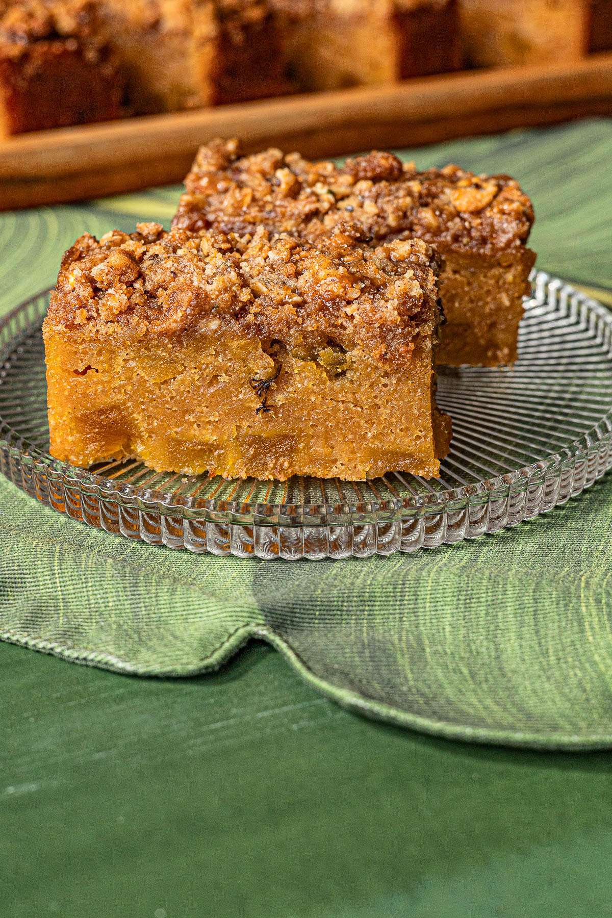 The next day when the Bibingka Apple Pudding Cake is completely cool cut into 18 small rectangles. Transfer it to a serving tray.