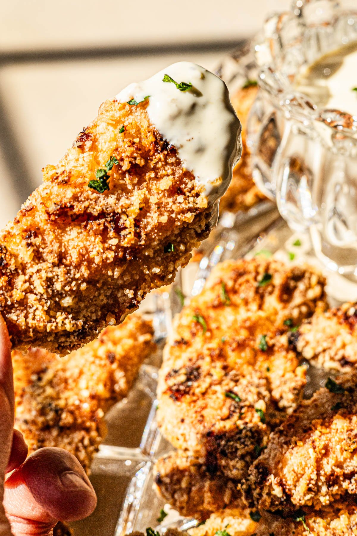 Dipping the Calamansi Chicken Tenders in the sauce.