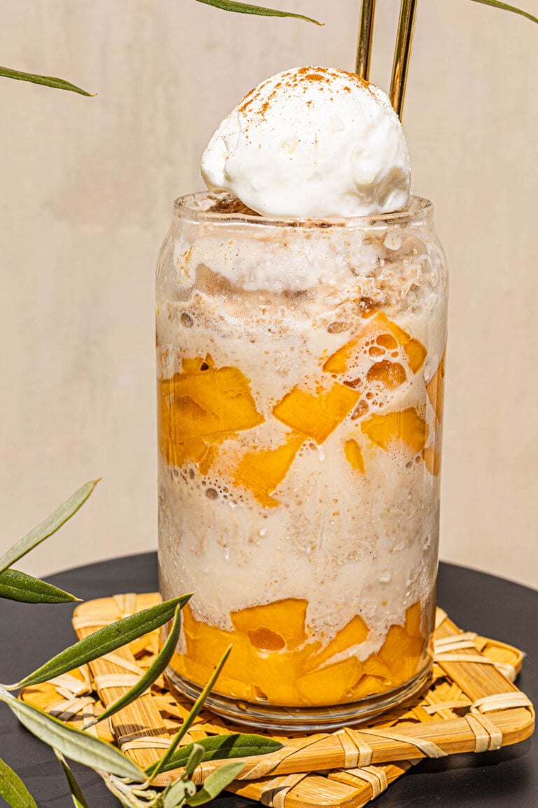 Mango Float Halo Halo made with graham cracker milk, fresh mangoes and vanilla ice cream.