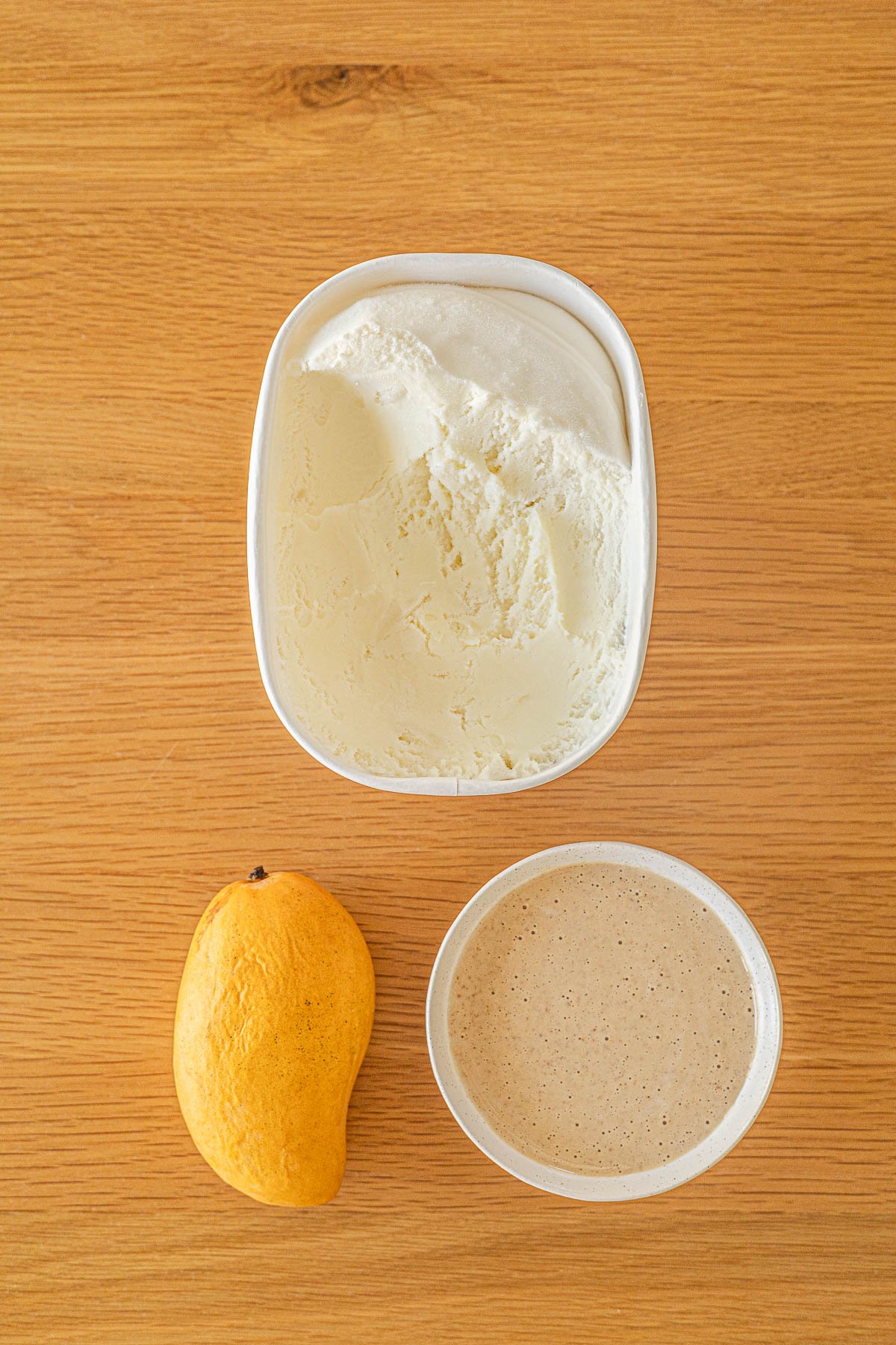 Repeat the mango, ice, milk and ice cream layers one more time.