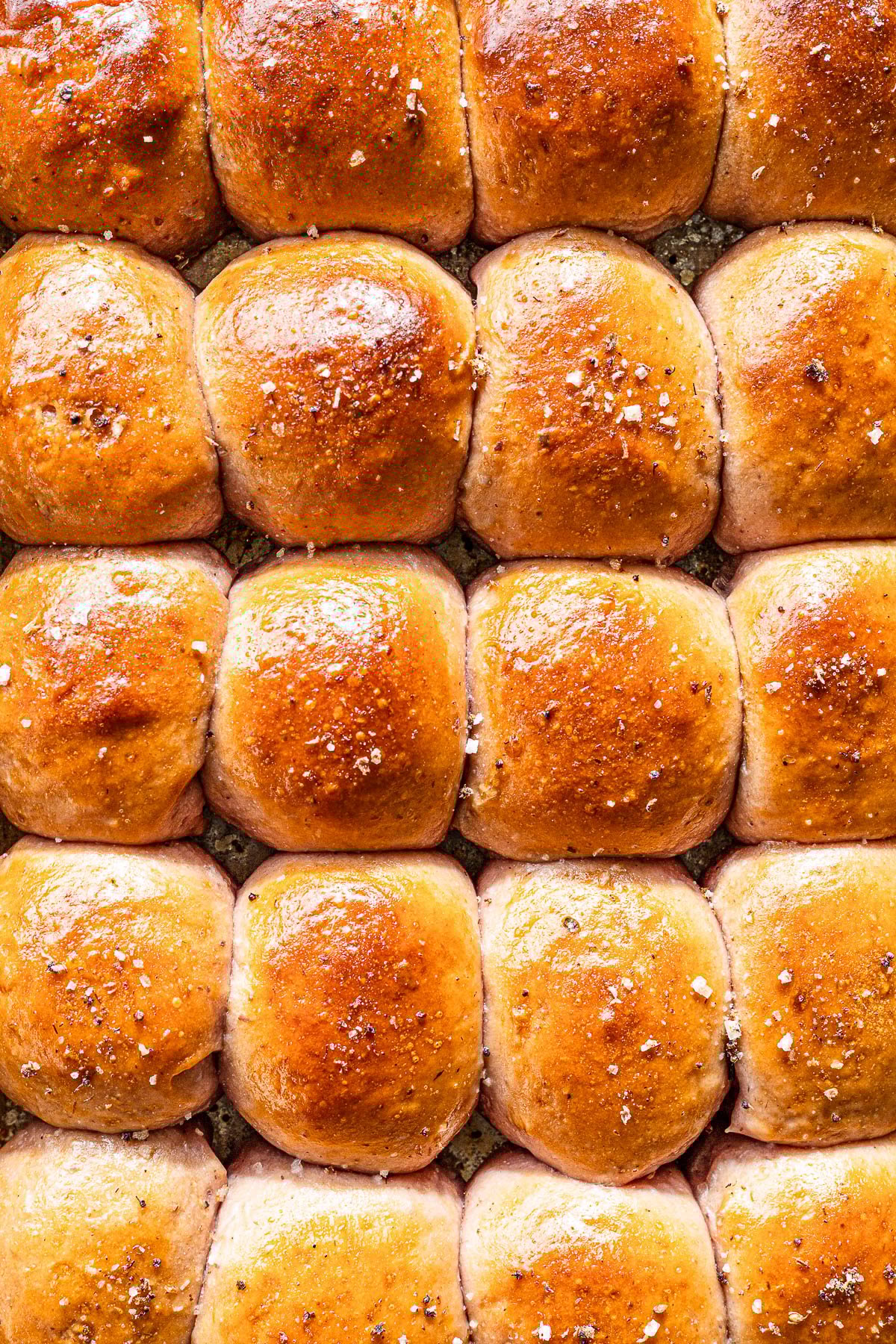 • There is an option to bake these way way ahead of time 1 week before and freeze them. To do that cool to room temperature. Take the rolls out of the pan and wrap in foil and place in the freezer. To defrost place in the refrigerator overnight still wrapped. To reheat place the rolls back in the pan you baked them in. Cover lightly with foil re-heat in the oven at 325 with the foil cover on for 15 minutes. Then brush with butter and garnish with salt.