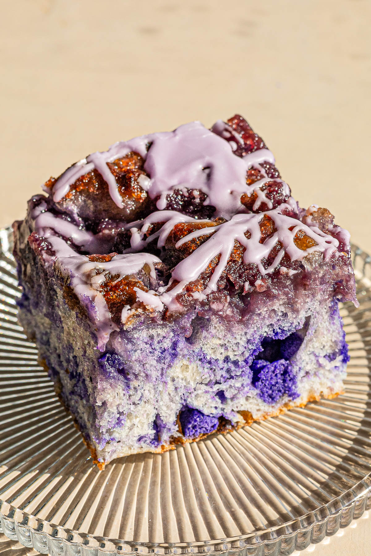 This Big and Bubbly Sweet Ube Focaccia is like eating a super huge fritter, but so much easier to make. The outer crust is super crispy and the bread is super soft. It's studded with Ube Polvoron and slathered with Ube Halaya. To finish it's drizzled with a sweet Ube Glaze.