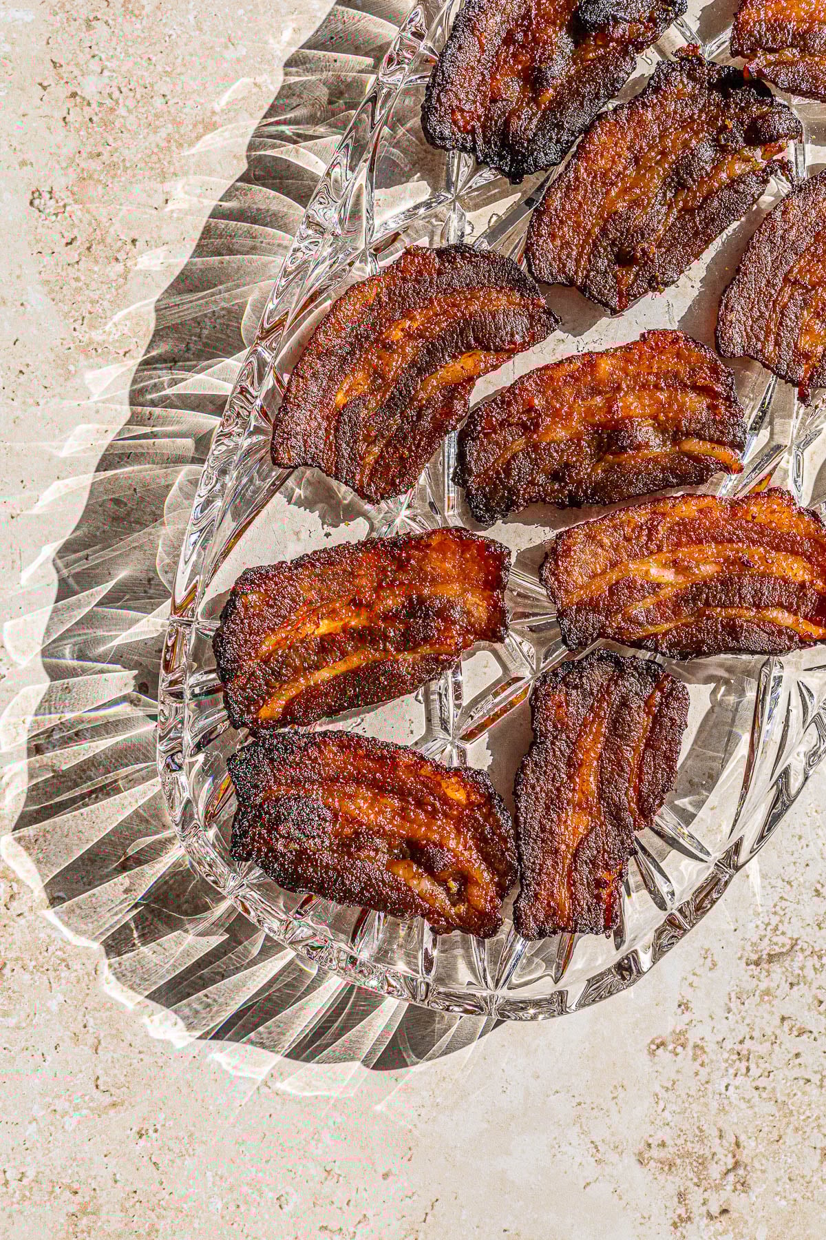 Tocino Bacon on a glass platter.