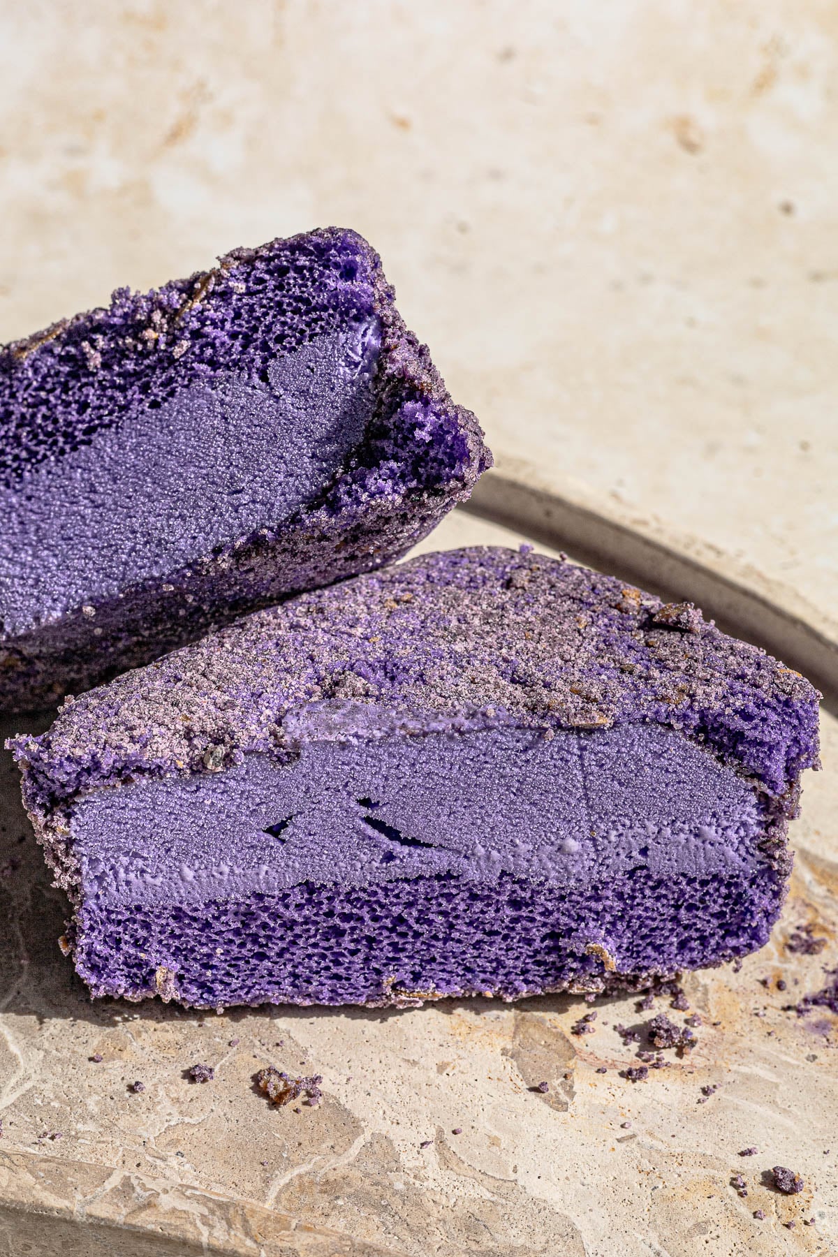 In this recipe we will be using fluffy Ube Mamon cake. It's great to use as the "bread" in an ice cream sandwich as even when frozen it is still nice and soft. It also absorbs melted ice cream really well.