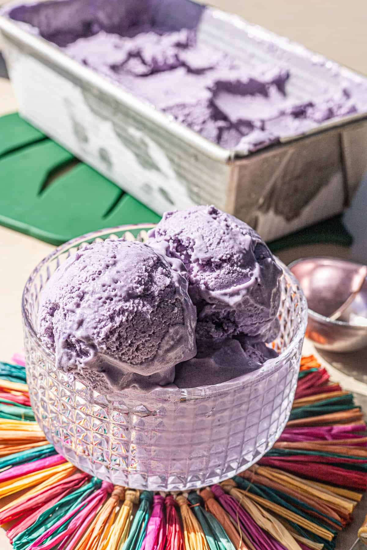 If you go to a Filipino grocery store Ube Ice cream is so hard to come by. All the restaurants are buying them up for dessert and Halo Halo! So we had to do a super easy 3 ingredient no ice cream maker needed version. We love 3 ingredient recipes here.