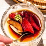 Almond Jelly with Tofu is a healthy spin on the Almond Jelly I used to have as a kid. Adding soft silky tofu adds protein to the dessert and no one will ever know. Served with a drizzle of date syrup and fresh fruit, it’s the perfect ending to a meal.