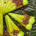 Mold and Cool - Transfer the Bibingkang Piniping to an 8 inch jello mold or pie dish that has been lined with banana leaves and brushed with coconut oil. Serve - If using a jello mold leave to cool and shape on the counter top for 24 hours. If using a pie plate it can be served when it is at room temperature.Top the Bibingkang Piniping with coco jam and crispy latik.