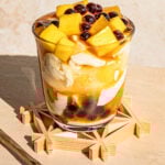 Place a scoop of mango boba in the bottom of each glass. Then layer some dessert tofu. Top with a few scoops of diced peaches. Followed by some fresh mango.