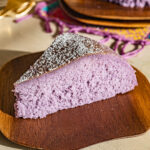 If you have a newer rice cooker pick the cake selection from the menu. Cook the Ube Cheesecake for 40 minutes. You may need to press cook twice for older rice cooker models like I have. To do that take out the hot rice bowl with the cheesecake in it and unplug the rice cooker for 5 minutes so that it cools down a bit. Then plug it back in and put the rice bowl back in with the half cooked cheesecake and press cook again to cook further. After 40 minutes it will look a bit puffy, but set in the middle. Leave to cool at room temperature and then cover and leave to chill overnight in the refrigerator.